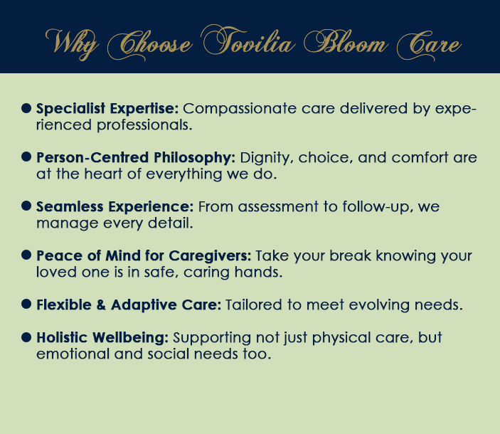 Experience peace of mind with Tovilia Bloom Care exceptional respite care services. Our respite care is designed to provide temporary relief and support for caregivers, ensuring your loved ones receive the highest quality of care in your absence.